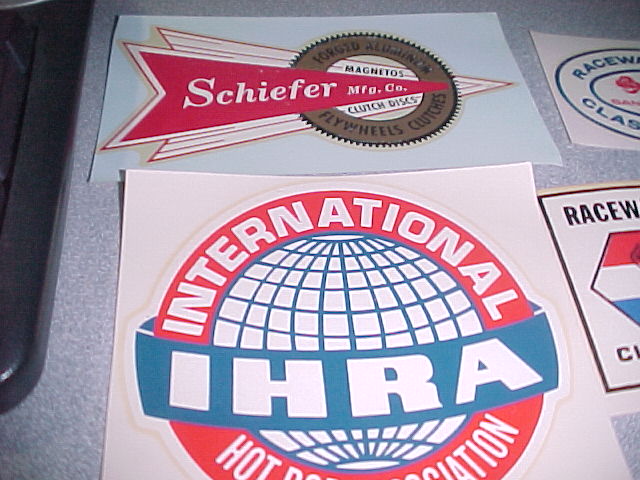 5 decals, IHRA,raceway park indianapolis, englishtown class winners, speedway, and a scheifer clutch decal. 60.00 all