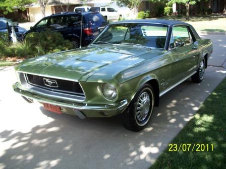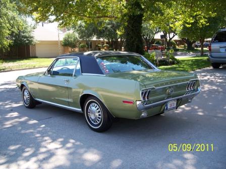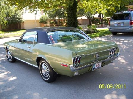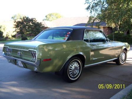I am going to copy Don's description and past it below. It has had one repaint, as described below. I will attempt to post pics, but I am not so good at posting. May be asking one of you for help. Here is Don's description: Don Schuchardt’s ’68 MUSTANG DESCRIPTION SUMMARY <span style="font-weight: bold">History</span> We bought this Mustang in 1988 from the original owner’s estate. The odometer showed 77,500 miles. The documentation includes the original owner’s purchase, registration, operating and maintenance papers, booklets, etc,- in perfect condition. I have a documentation file of all the restoration, upgrades and repairs and appraisals which I’ve done and had done since owning the vehicle.The information below covers the important applicable description and data for the Mustang. The Mustang has been garage-kept and never ran in inclement weather since restoration. The valves were ground at about 100,000 miles.It still runs great, and doesn’t use oil or smoke. The engine is quiet. The oil filter and oil (Valvoline premium) have been changed at about every 2,000miles. The odometer now reads about 23,300 miles. Regular maintenance and repair have been performed as needed. <span style="font-weight: bold">Mustang Description</span> VIN (Warranty number): 8F01C154714 – both door panel and instrument panel tags agree. Vehicle Data: 65 I 2G 06B 652 W C, w/interpretation as follows: Body: 65A = 2 door hard top Color: I = Lime gold metallic Trim: 2G = Light ivy gold & medium Ivy gold vinyl Date: 06B = February 6 DSO: 65 = Oklahoma City, OK Transmission: W = C-4 Automatic Engine: C = 289 2/V Appraisal Summary General Condition: Interior – Above average Exterior – Above average Underecarriage –Average Engine – Above average Engine Compartment – Above average Trunk – Average Drive-line – Above average Factory Options: Vinyl top Delux interior SunX glass (tinted) Remote controlled driver-side mirror Matching non-remote controlled mirror passenger side In-dash air conditioning Power brakes Power steering 3-row heavy duty radiator (upgrade) Rubber Pony floor mats – front After Market Adds In-dash AM/FM/Cassette stereo w/ front & rear speakers Electric quartz clock Trunk light * Military spec undercoating * Burglar alarm – needs repair Electronic ignition * Door protection trim * Mud flaps * Suspension grease fittings * Note: * indicates not included in appraisal. <span style="font-weight: bold">Appraisal</span> Comments: “I find this vehicle to be in excellent mechanical condition. This vehicle is ninety percent restored to factory original. All areas of this vehicle are in solid condition.”The total appraised value as of May 19, 2008 was $16,850. Extras I have several additional Mustang parts and related items which I’ve collected and would also sell at a negotiated price. They are as follows: 1) Original AM radio 2) Collection of Mustang Monthly magazines – about 25 years, excellent info source 3) Original drive shaft & U-joints 4) Two Mustang shop manuals 5) Original shock absorbers – usable 6) Original A/C compressor – replaced with new 7) Two extra (original) wheels w/tires – spare tire is original 8) Several cans of A/C refrigerant Freon 12 9) ’68 Mustang trailer hitch 10) Original driver side mirror 11) Collection of Mustang miniatures 12) Miscellaneous – new fuel pump, shop wall plaques Price I will sell the Mustang for the currently insured value of $17,000. My insurance company (Hagerty) feels that my Mustang has appreciated in value since the 2008 appraisal and supports the currently insured value of $17,000. Contact ![]() Now, here is my attempt to post pics.