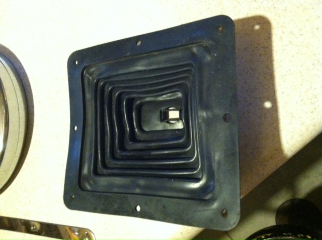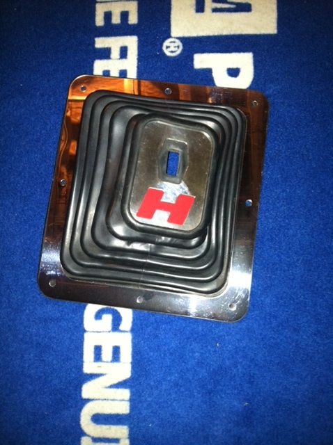 Old Skool Hurst # 114-7494 Super Boot. I don't believe this has ever been used. The retaining bezel had the protective plastic on it till I took the picture, and the boot is soft and unblemished. The top plate (insert) shows some shelf wear after 40 years, but still presents nice (just not as crisp as the retaining bezel). The flat steel under the top plate (red H) has been lightly glass beaded and repainted. The back side is how it left Hurst. It was seriously faded and I just couldn't handle it. I'd like to get $85 plus shipping, PM me if interested.