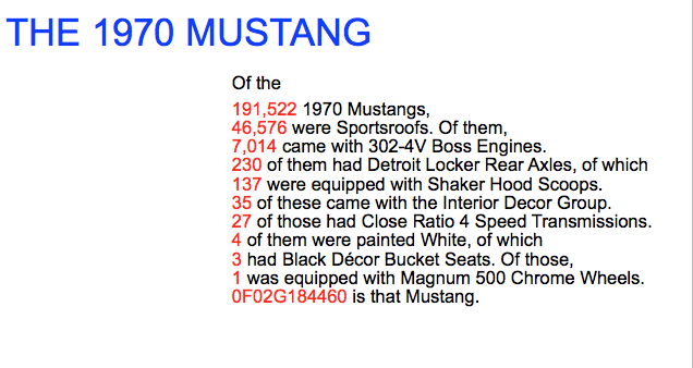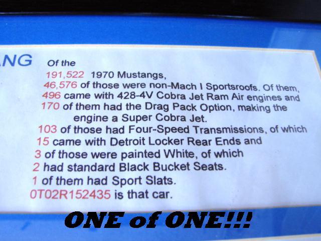 Trust me - when you see dealers on eBay bragging how their Ford is "1 of 1," Ford people just roll their eyes. There's plenty of folks making claims about their cars - even Camaro owners - but Ford can substantiate it. Doesn't mean it's not useless, unless you want to make a claim like only 1 Fairlane GT was built with the 427 in 1967 - that, to me, is a "true" 1 of 1.