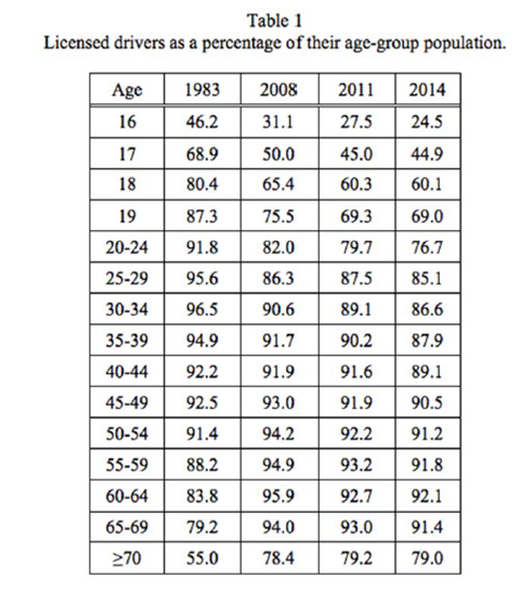 Chart definitely depicts trend I have been seeing. My daughter's college roommate did not get drivers license till age 21 or 22. I think a lot of parents have that helicopter/protective mentality and do not want to push the issue. At age 48, everyone I knew in high school could not wait to get learners license at 15 and full license at 16.