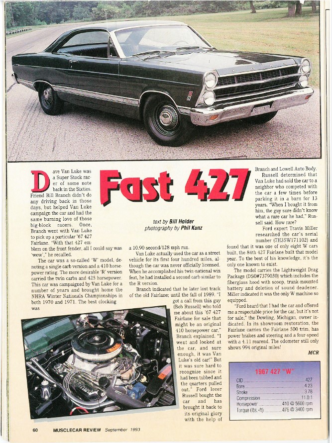 1967 Ford 427 Fairlane 500 Hardtop Dark Moss green/Black interior 4 speed Very Rare W-Code, single 4bbl original drivetrain & body with its 980 original miles & 3:89 rear , Documented as only 11 built. Dearborn Award Winner, Owned for 14yrs & first time for sale!! Advertised here first! Folder FILLED with docs and history!! Well known racer with NHRA wins.. Very special car coming out of a private collection with other rare cars.