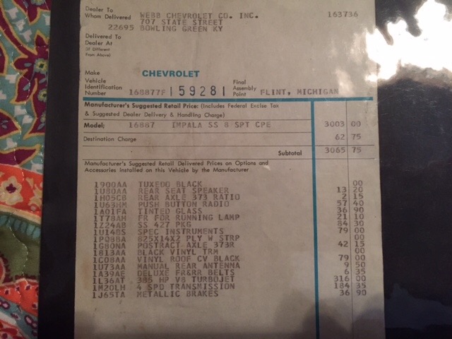 It time to move Ol Black on,that's what original owners always referred to it as. Sold new at Webb Chevrolet in bowling green ky. All original paint except hood was primered years ago,it is original hood. Engine is ce block,the original owner has a neat story how that came about.block is 351 casting,casting date is April 67.engine may have 3k miles on overhaul,forged Pistons,small Howard's camshaft.the rest of engine is original to car,heads,intake,carb,alt,dist,air cleaner.trans is 65 m20,once again original owner has a story how that came about.it has its original 12 bolt,original 3.73 posi,now 3.31's.