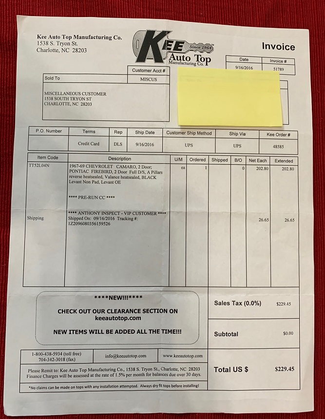 SOLD Key Auto Tops, Brand new vinyl top ordered for car going to Nationals sold car never used.