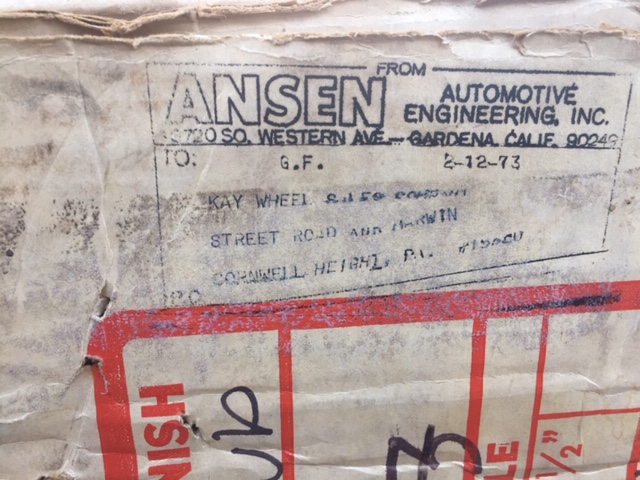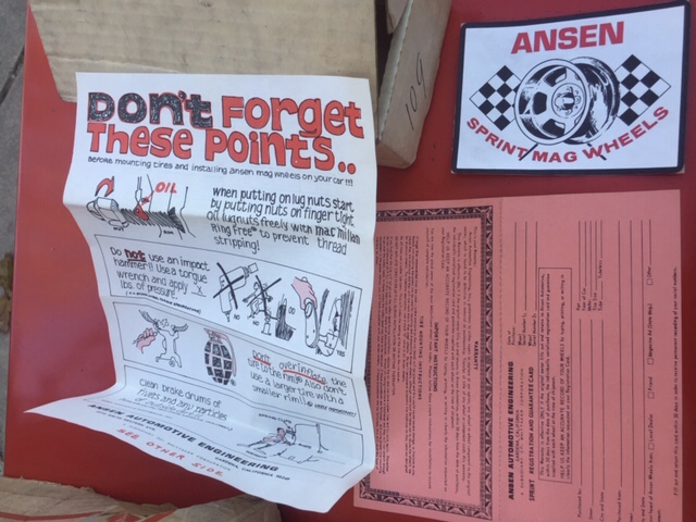 15”x7 1/2” New Old Stock! ANSEN SPRINT MAG WHEELS Still in there original February of 1973 dated ANSEN AUTOMOTIVE ENGINEERING boxes back when they were out of Gardena Calif! Not the modern American racing version that has the stepped lip around each slot and later mounting style acorn nuts. These are the iconic original slot design and are GM 5 on 4 3/4” bolt pattern 3” back space. These came from the shelf of a speed shop that closed years ago. Also included is original paperwork, mounting instructions,warranty card, and ANSEN decal. SOLD plus shipping