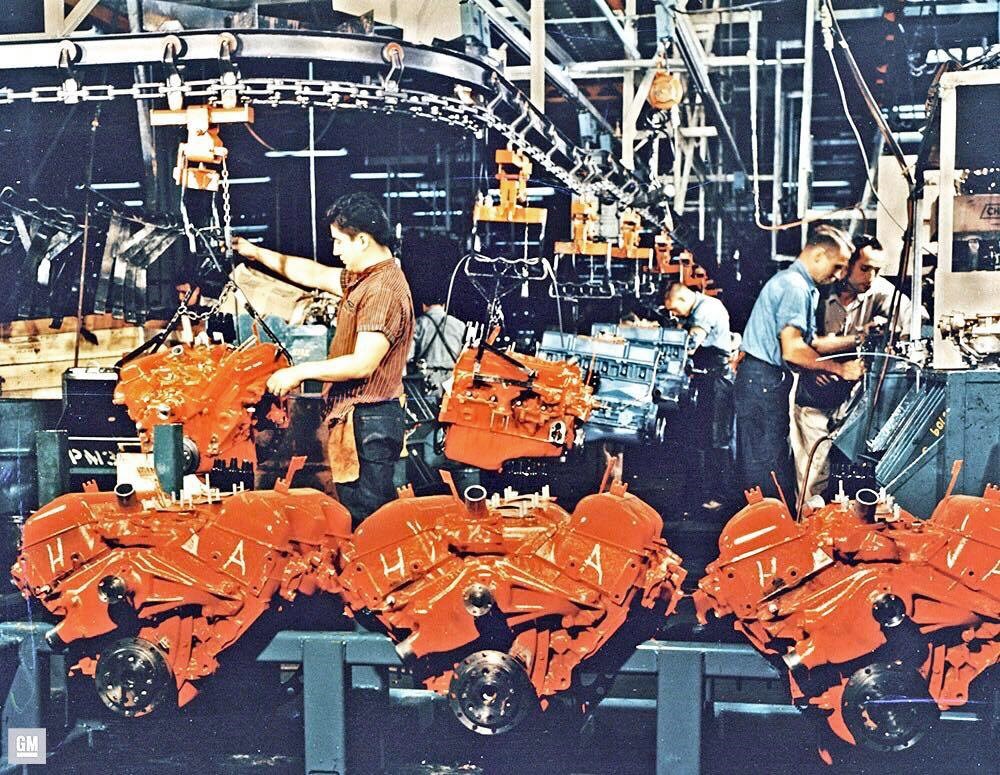 Another cool photo from the GM Archives, but there's a debate as to what year this is from. Appears to be tri-power intakes on the big blocks, with small blocks and 6-cylinders on the hoists.