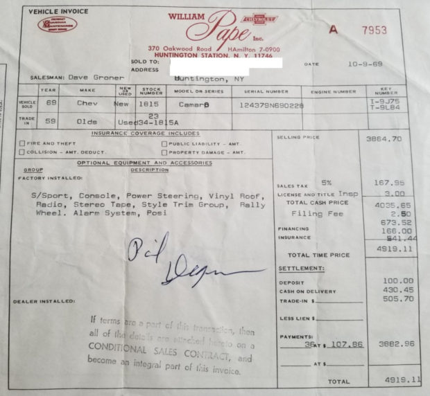 Give or take a few dollars on the destination charge, the MSRP would have been $3,685.70. That means they charged the customer $179 for the alarm system. Sales tax is stated as 5% but calculates to 4.3%. There is an unspecified charge of $41.44. No discount but I doubt a ’59 Olds would have been traded in for $505.70 in 1969. The NY registration label on the windshield lists the VIN as 124379N690228; the VIN tag and invoice shows 124379N690222. Wonder what VIN is on the title. The protect-o-plate photo is hard to read but the last character of the VIN looks more like an 8 than a 2. On the invoice, the last character of the VIN is typed on a line but the line under it is not visible as it is in several other areas on the form. The dash top has been replaced so the VIN tag has been removed from the car. Got some things to clarify here.