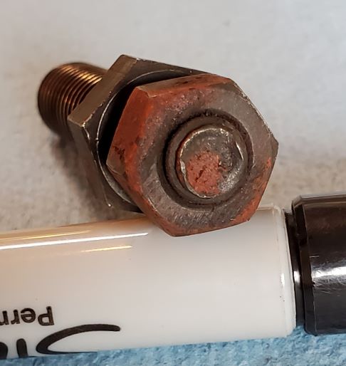 Original unrestored TCS solenoid to intake manifold mounting stud and nut. Stud still retains all of its original black phosphate plating as does the nut. Both of them have original orange overspray on them. You won't find nicer original pieces. $35 PPFF