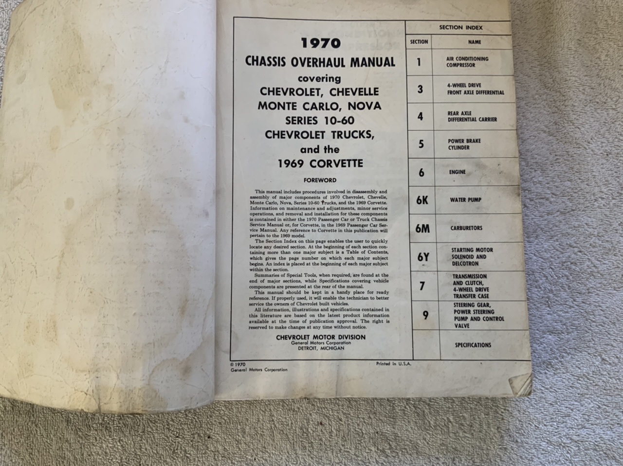 I have a very well worn and used 1970 chassis overhaul manual. This manual is for passenger cars, 10 to 60 series trucks and 1969 Corvette as well. It is original not a reprint, The bindings are still fair and holding up. $15. Plus the ride. Shipping will be in a flat rate USPS bubble envelope at $7.50 to the lower 48 states. Payment to be made through PayPal via friends and family so that I don’t get dinged on fees.