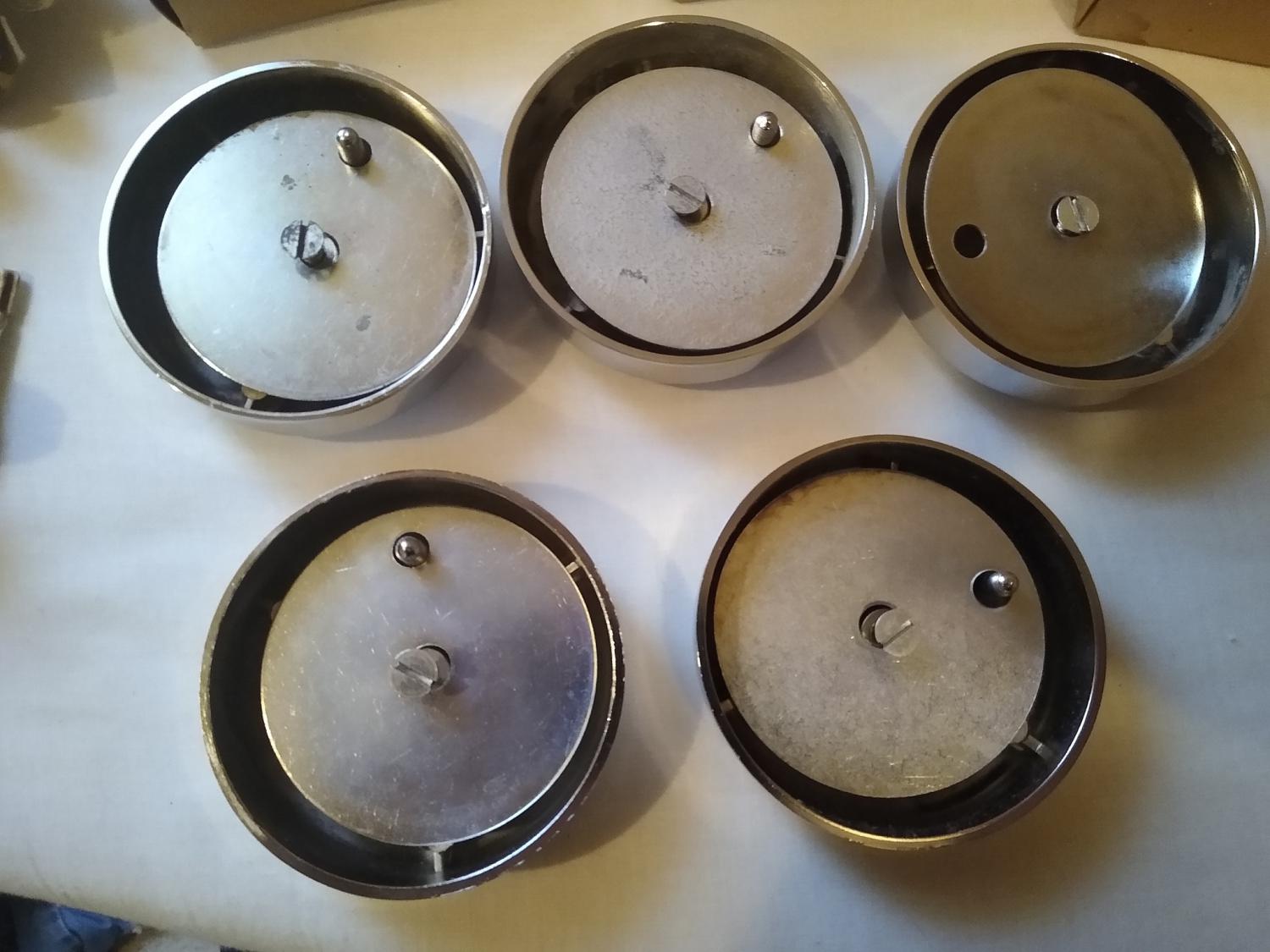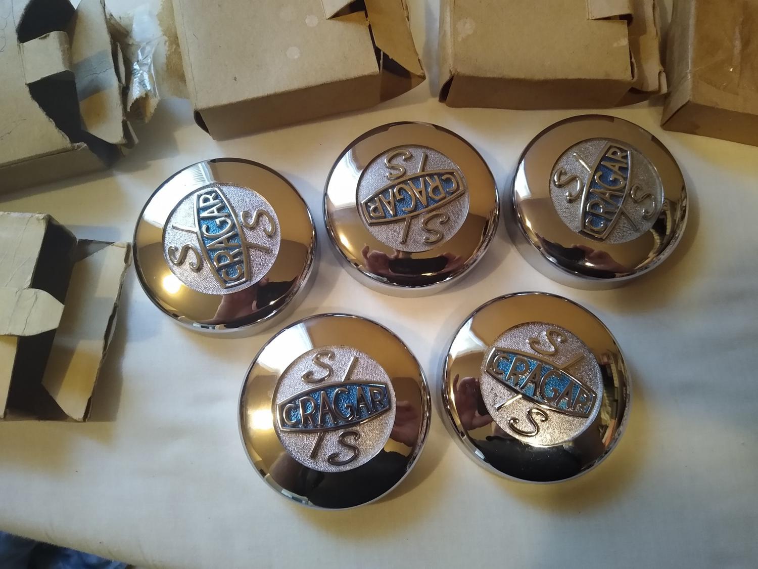 5 NOS Cragar caps for 14 and 15 inch wheels. Matched set. Early turquoise color blue (later went to darker candy blue). Keep one for a spare. Hard to find these as a matched set because so many variations of lettering size/font, paint, border edge size etc.