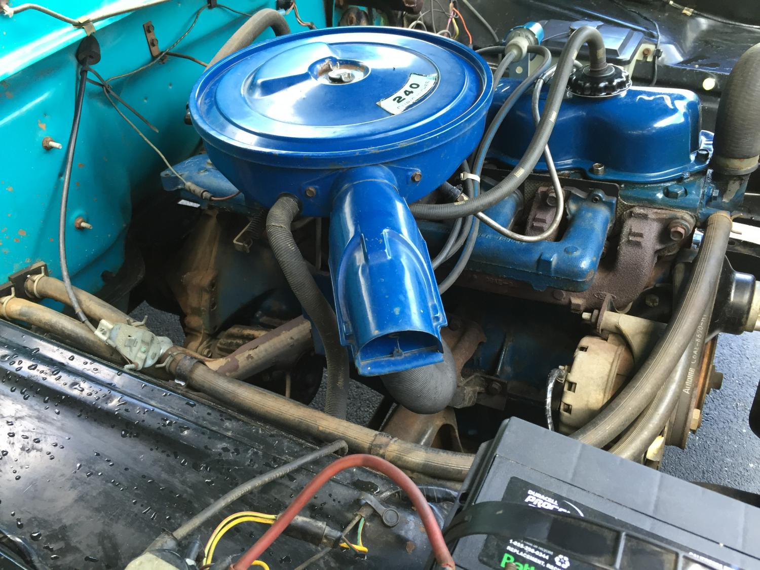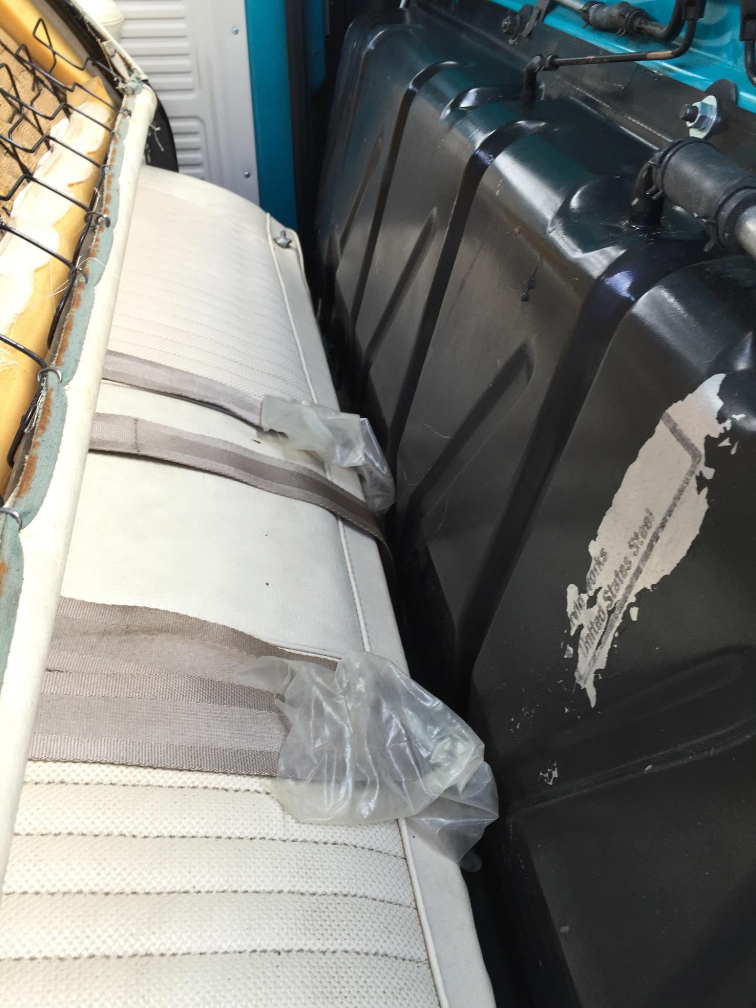 It has all original hoses , belts and stickers and chalk markings . The rubber floor mat is perfect as well as seats headliner and dash . Notice how he pushed the Factory plastic coving for the seatbelts behind the seat still in place . The paint is factory original throughout, the bed had some paint wear from light use .