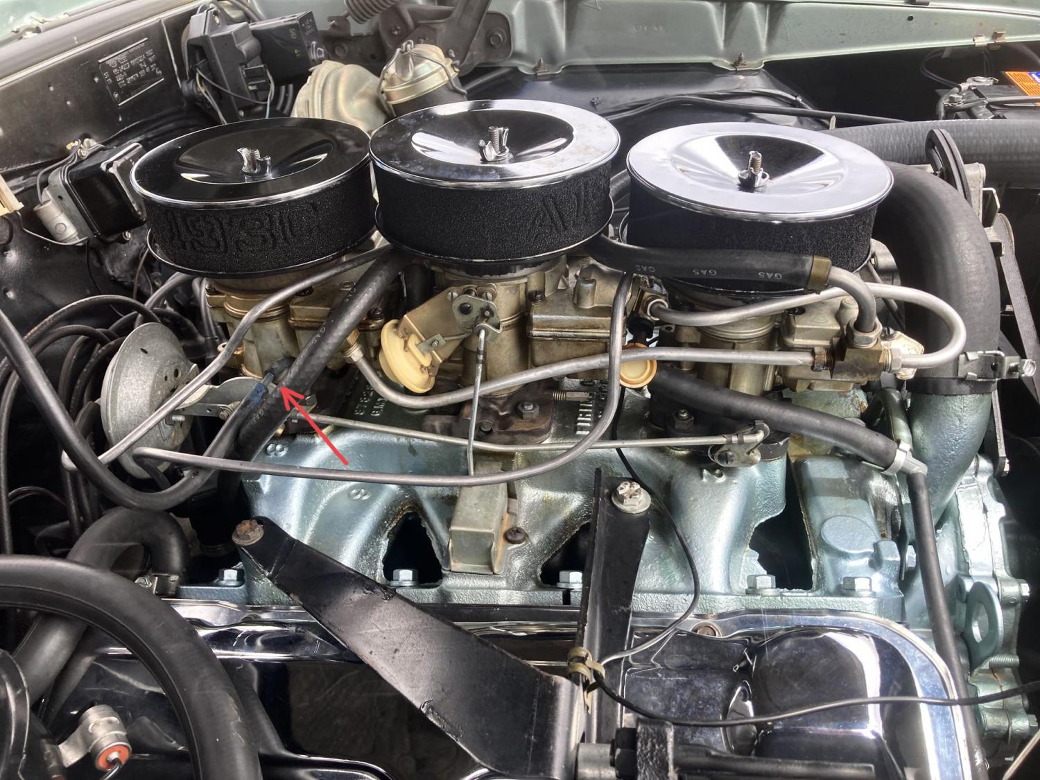 Interesting there is no hose going to the hollow carb mounting stud on the pass side front of the rear carb.Just has a rubber cap on it?Tom
