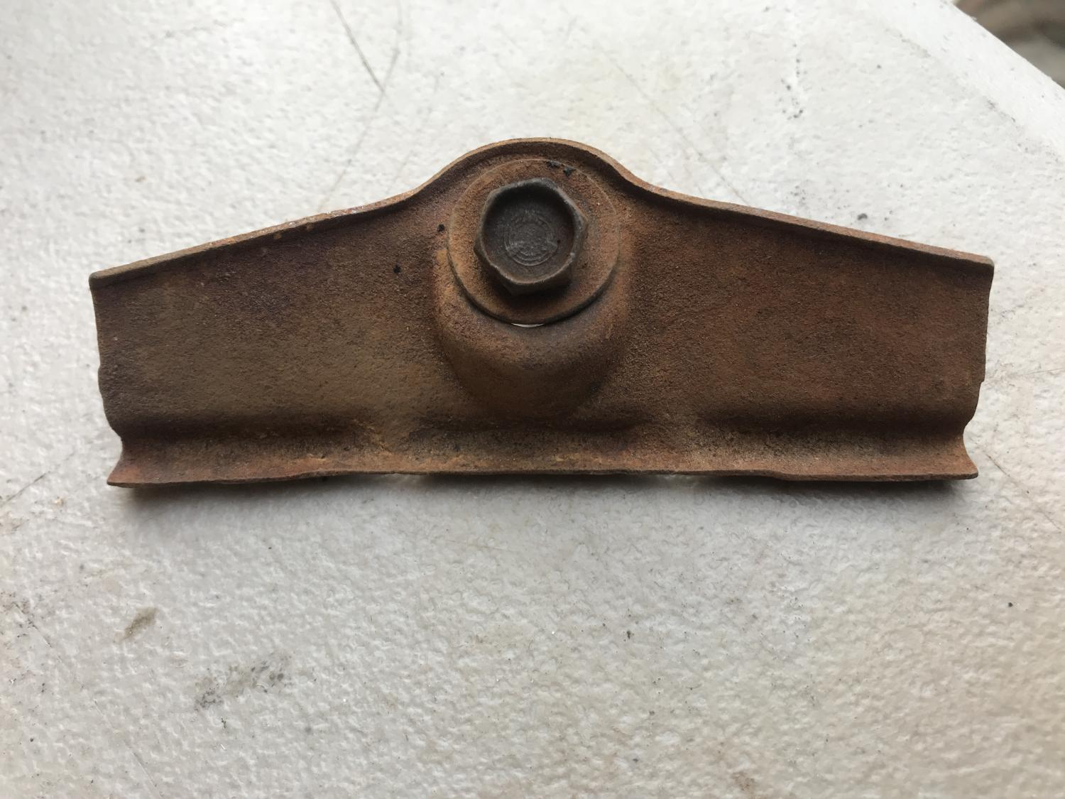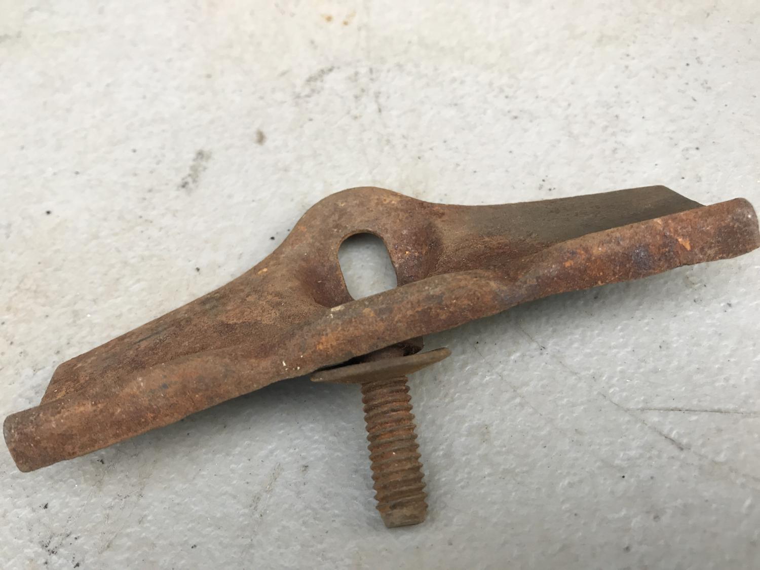 This one stamped "K" and includes the original 1/2" head bolt (RBW I think) and bent trapped washer - over tightened once like they nearly all were at one time or another. Rusty, but real and a rare assembly line piece that should blast up OK. $95 PPFF shipped & insured via USPS. |