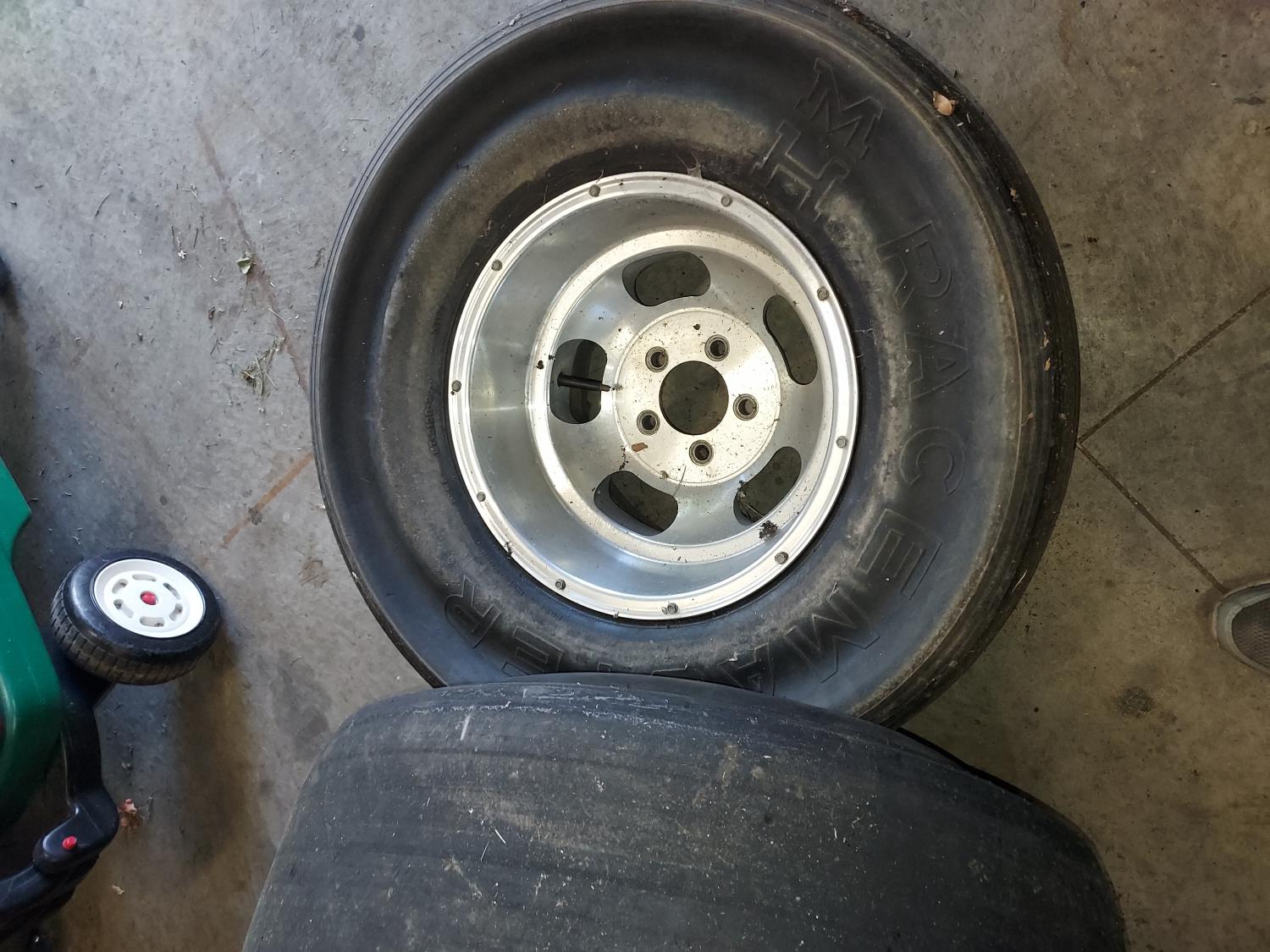 This is a set of 15X10 aluminum slots with 12.2/31.2/15 slicks with tubes. These were on my 1969 Nova they held air and I drove around with them but more for show than go. Lug nuts included I can hold and deliver to the show in Rosemont next month. $500