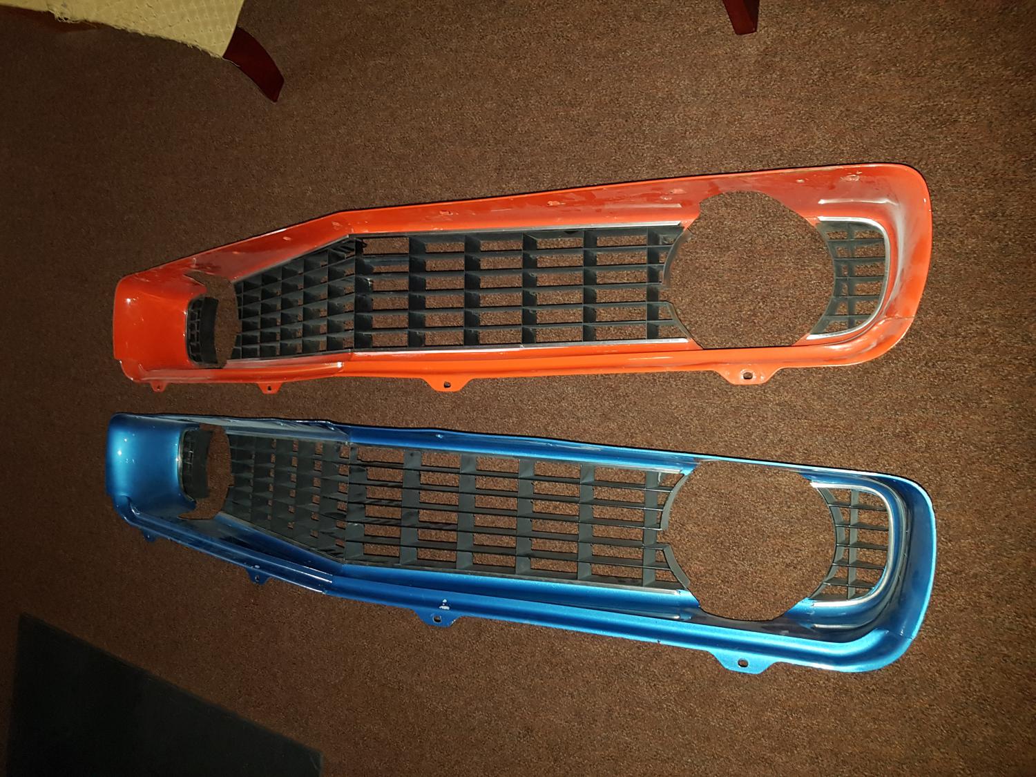 2 Used GM Front Grilles for sale. These are in great shape with no cracks or broken mounting holes. One is Orange with black insert and the other is blue with black insert. $450 US each. Shipping is not included. Items are in Canada. Thanks for looking.