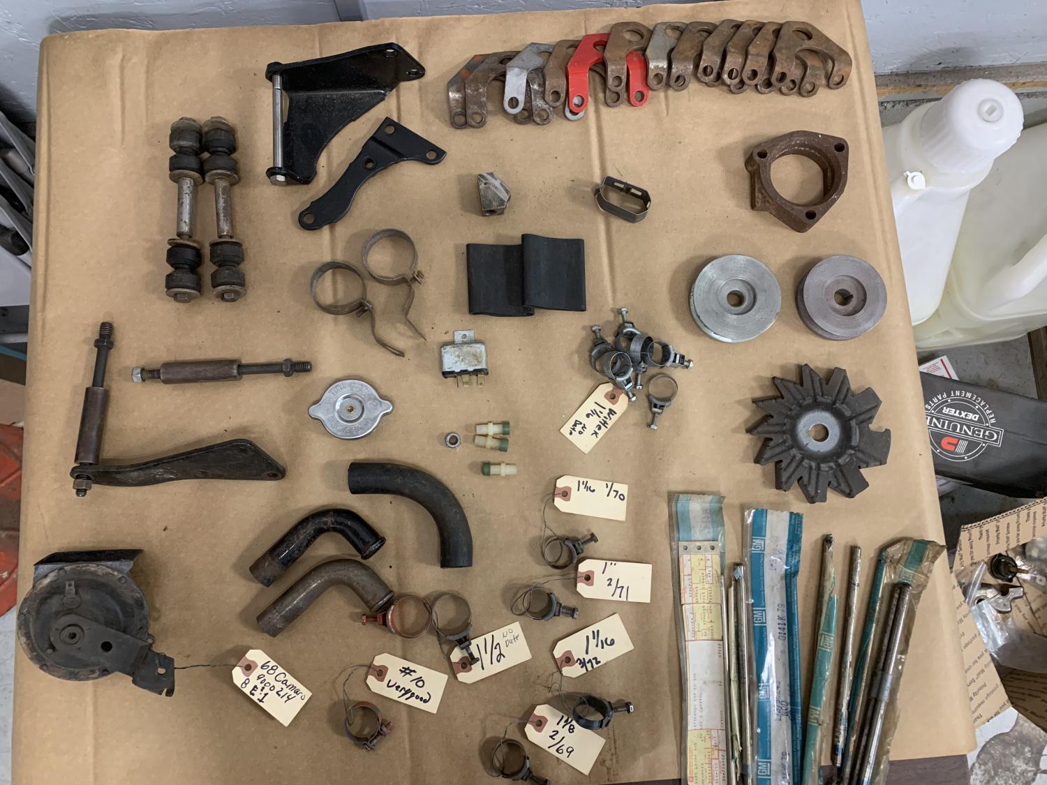 Air cleaner crank case vent tubes. Metal tube. 35.00 each sold Rubber tube 25.00 BB lower alternator bracket with stud & spacer. 40.00 sold BB lower alt. Stud & spacer. 25.00 sold Sway bar end link hardware complete. WB head mark bolts. 45.00. Sold SB A.I.R. Brackets. Two piece with pump long bolt. 45.00. Sold BB fuel filter bracket. 30.00 each 68 camaro horn. 9000214 dated 8 E? 1. 40.00 sold AC RC 15 cap for restoration. 45.00 sold Hurst shift knob nut. Good driver or replate. 20.00 NOS Danko green cap axle vent. 35.00 each Jack storage rubbers. Like new. 30.00. Sold BB rear engine lift hook. 35.00 each all sold Alt fan with hook. 35.00 sold Alternator deep groove pulleys. 75.00 each one without keyway is sold BB heat riser spacer. 35.00 Heater hose clamp at fender well. Good finish. 35.00 Nos belts. 469584, 14082454 & 469594. 25.00 each Hose clamps. 1 1/16 no date great finish nos? 20.00 each. Sold 1 1/16 dated 1 of 70. 25.00 1” dated 2 of 71 25.00 1 1/16 dated 3 of 72 25.00 1 1/8 dated 2 of 69. 35.00 1 1/2 no date 20.00 # 10 no date. 20.00 Fuel line block. 25.00 sold All prices include shipping to lower 48. Pay pal friends & family. Thanks Eddie Last edited by all_about_cars; 11-29-2021 at 10:43 PM. |
