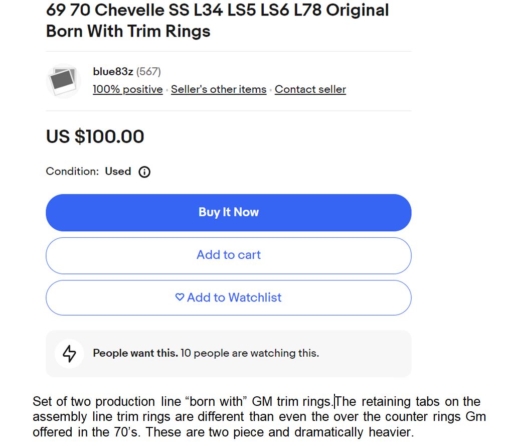 Found this active Bay listing and the seller has listed "born with Chevelle" type trim rings. These appear to match the "different" type trim rings that I picked up and had previously posted pictures of. I am now assuming they are a legitimate older version GM trim ring. Guess we need a Chevelle expert to weigh in with their opinions. Thanks |