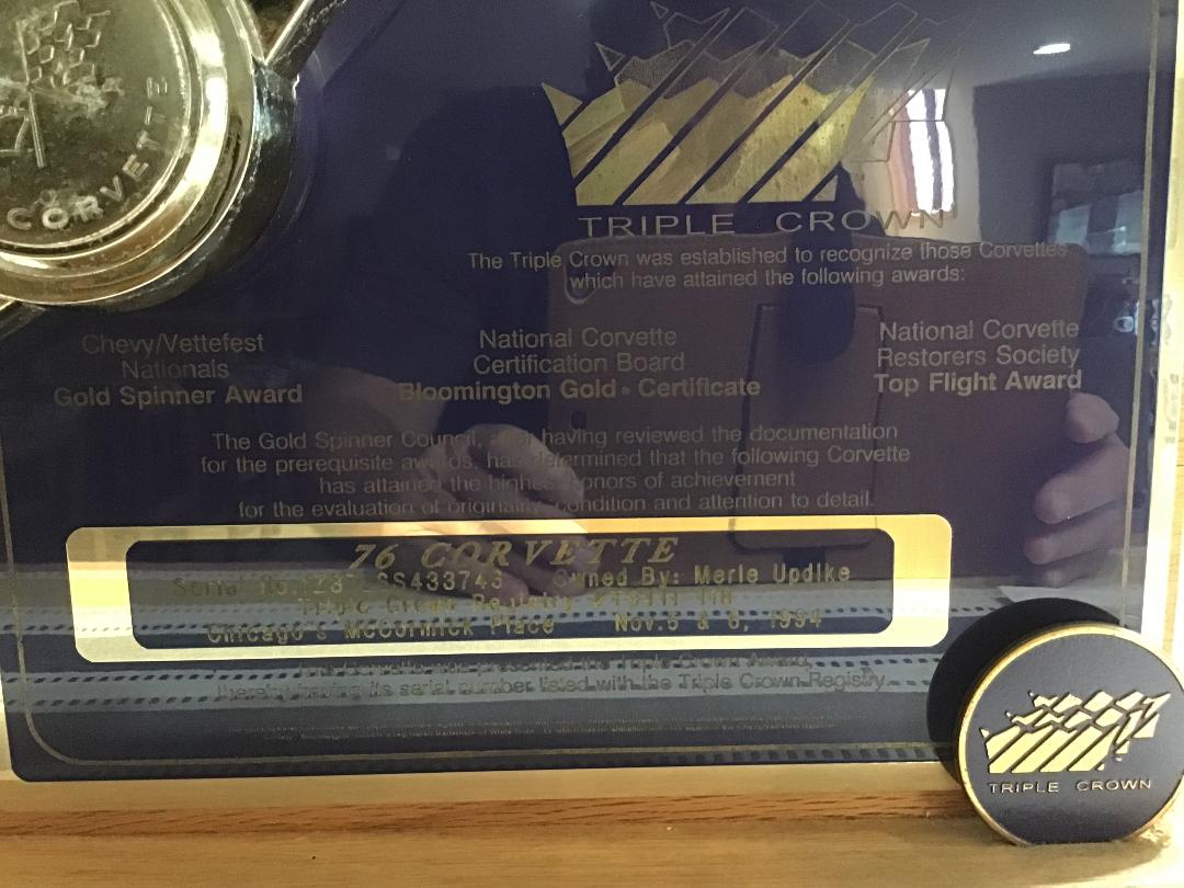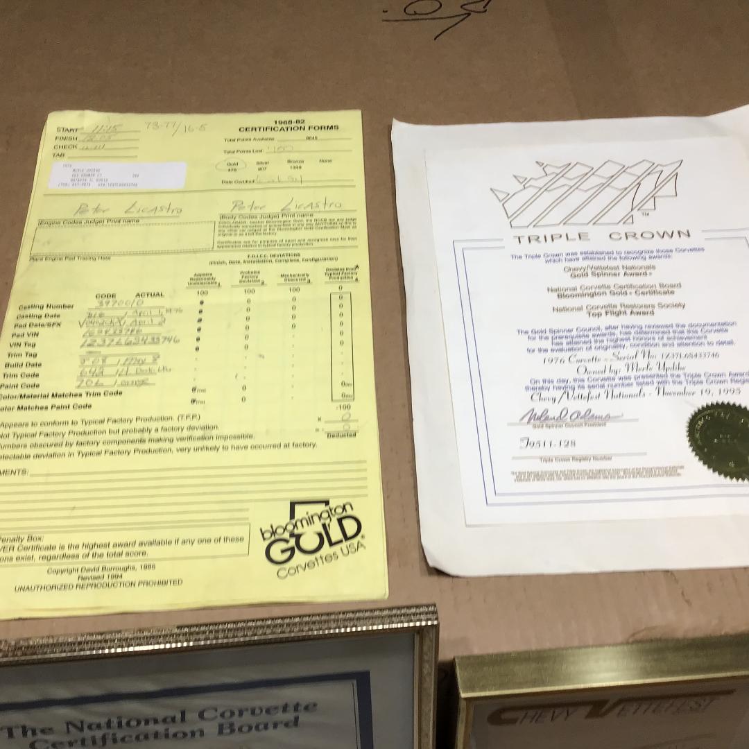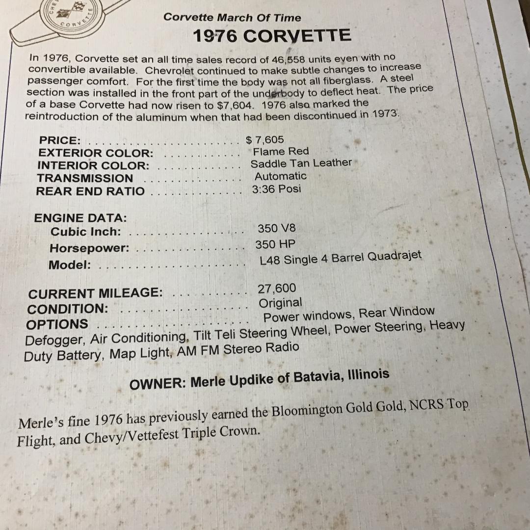 1976 Corvette Flame Orange / Saddle Interior. NCRS Top Flight, Bloomington Gold Certified, Chevy Vette Fest Gold Spinner and Showcase Certified along with a Triple Crown Award. Original Paint, Interior and Drivetrain. Loaded with every option available. Completely serviced to be driven or shown, everything works as designed. The nicest un-molested, original Corvette I have seen in a very long time, a True Time Capsule. All documentation from new includes all awards, and judging sheets. $32,500.00 PM me for any questions or comments. Bill