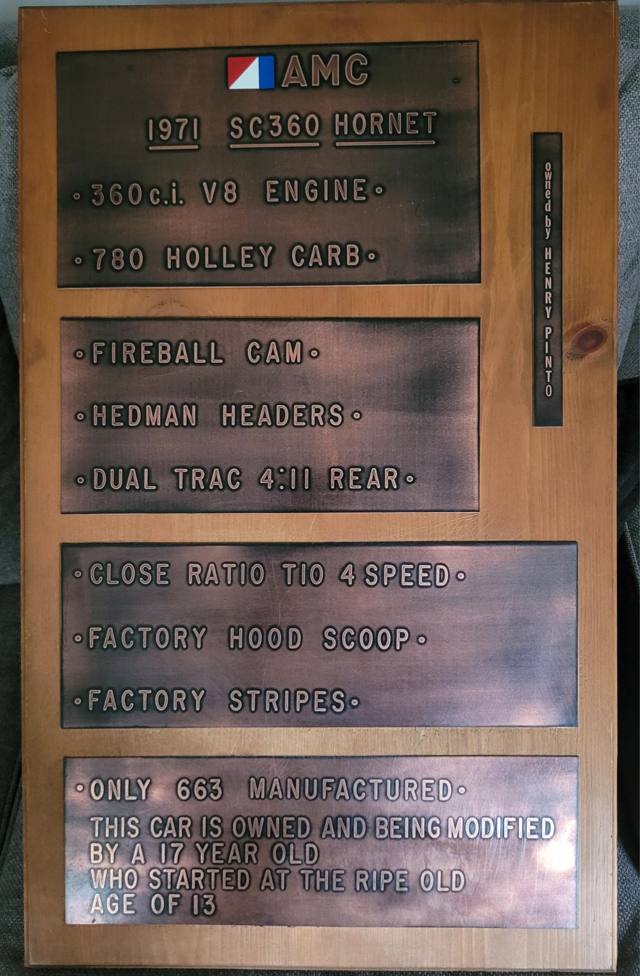 Turns out Henry(his name) bought the car from behind a butcher shop in Northern NJ in 1978. He was 13 or 14 years old. It was a basket case. He spent all 4 years of high school building the car, and skipping school to hunt down parts and put it together. He was able to send me 1 picture he had, though he says he will go through some albums at some point because he’s sure he has more photos. He also sent me photos of the plaque his mom had made for him. She worked at Bendix aviation and had some of the guys make it as a gift. He drove the car from about 1981-1986. He had 4.88’s in the rear and one day spun a main bearing in the 360 he built and lost oil pressure. He was about to get married and his soon-to-be wife didn’t like the car anyways. So he sold it to the guy I eventually bought it from. Henry told me he searched for years trying to find the name of the guy he sold it to, but never had any luck. We still keep in touch and he’s thrilled to know the car is still around. |