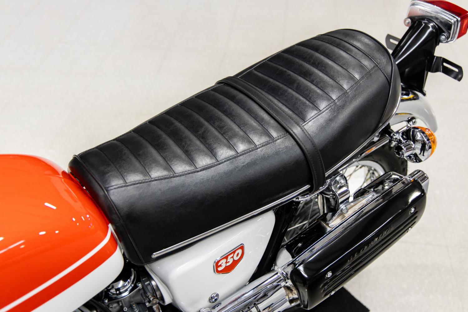 The entire motorcycle was completely disassembled to a bare frame. The frame was stripped and then powder coated black. It's equipped with a center and side stand. It's also equipped with new foot pegs. The OEM headlight bucket, front forks, 2.4-gallon fuel tank and side panels were painted in the correct colors of white and orange. The paint was purchased from Randy Marble who specializes in paint for restorations of vintage Japanese motorcycles only. The high quality paint was recently detailed to a glossy finish by the team at MS CLASSIC CARS. The fuel tank and side covers were decorated with Honda 350 emblems. All of the chrome was professionally re-chromed. The OEM cross-braced handlebar is mounted to the top triple clamp and supports the mirrors and levers. A set of NOS Nippon Seiki instrumentation was added consisting of a 110-mph speedometer and a tachometer with a 10,500-rpm redline. The five digit odometer shows 71 miles. It's equipped with OEM turn signals on the front and rear. It was outfitted with OEM front and rear fenders. The fenders were dressed with NOS marker lights. The rebuilt suspension consists of a telescopic fork as well as dual shocks mounted to the swingarm. Braking is handled by front and rear drums that were completely rebuilt. The front brakes feature a twin leading-shoe design. The motorcycle rolls on OEM DID stamped 18” and 19” wheels that were completely restored including the new spokes. The wheels are wrapped with new Dunlop Gold Seal K70 3.25-19 tire on the front and 4.00-18 tire on the rear. The OEM seat was re-foamed and upholstered with a reproduction seat cover. It was setup with a complete new wiring harness.