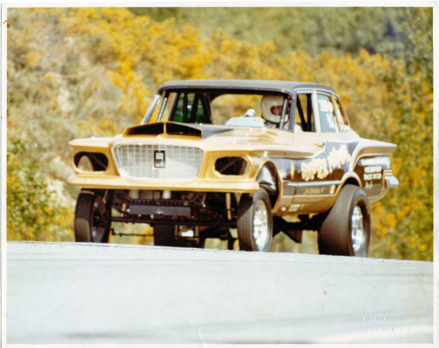 "The basis for "The Spy Machine" is a 1961 Valiant Signet.Both axles were moved forward,the front (solid) so that the curve of the fender touches behind the bumper,(one piece fiberglass front clip),the rear radius is larger and higher,the hood scoop was one off not from any car. First 2 photos taken @Mission,BC circa 1968.Friend & me (peace sign) at Van Isle Raceway (Vancouver Island) waiting to make a pass." Last edited by Mr70; 12-11-2024 at 12:47 AM. |