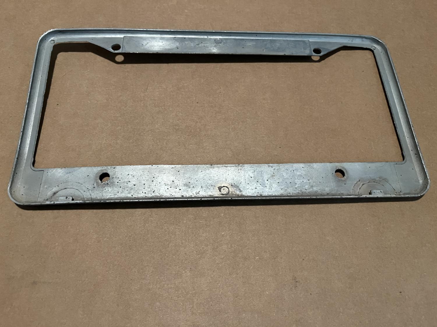 I have a genuine as leather vintage JONES license plate frame available. It is the green version (only color I've ever seen in person) and has a nice patina to it; it's not perfect of course but still retains most of its original chrome finish (as in it's not pealing) albeit pitted ever so slightly. I'm not convinced it's original paint (both colors) but could be I suppose - the green might be the correct (original) translucent finish - some of the white is still present. It does not appear to ever have been replated or refinished but is a prime candidate for a restoration if desired. This is a VERY difficult frame to source in any condition. It presents as a nice survivor piece to me and could be restored I'm sure. No breaks or cracks visible; it's solid. It is NOT a reproduction or recreation, it is real and certainly original. Several very detailed and up close photos below to show all the detail. There is a very slight wow in it that does not affect eye appeal, again, IMHO. This is an awesome and seldom seen frame. Cheers all, Anthony |