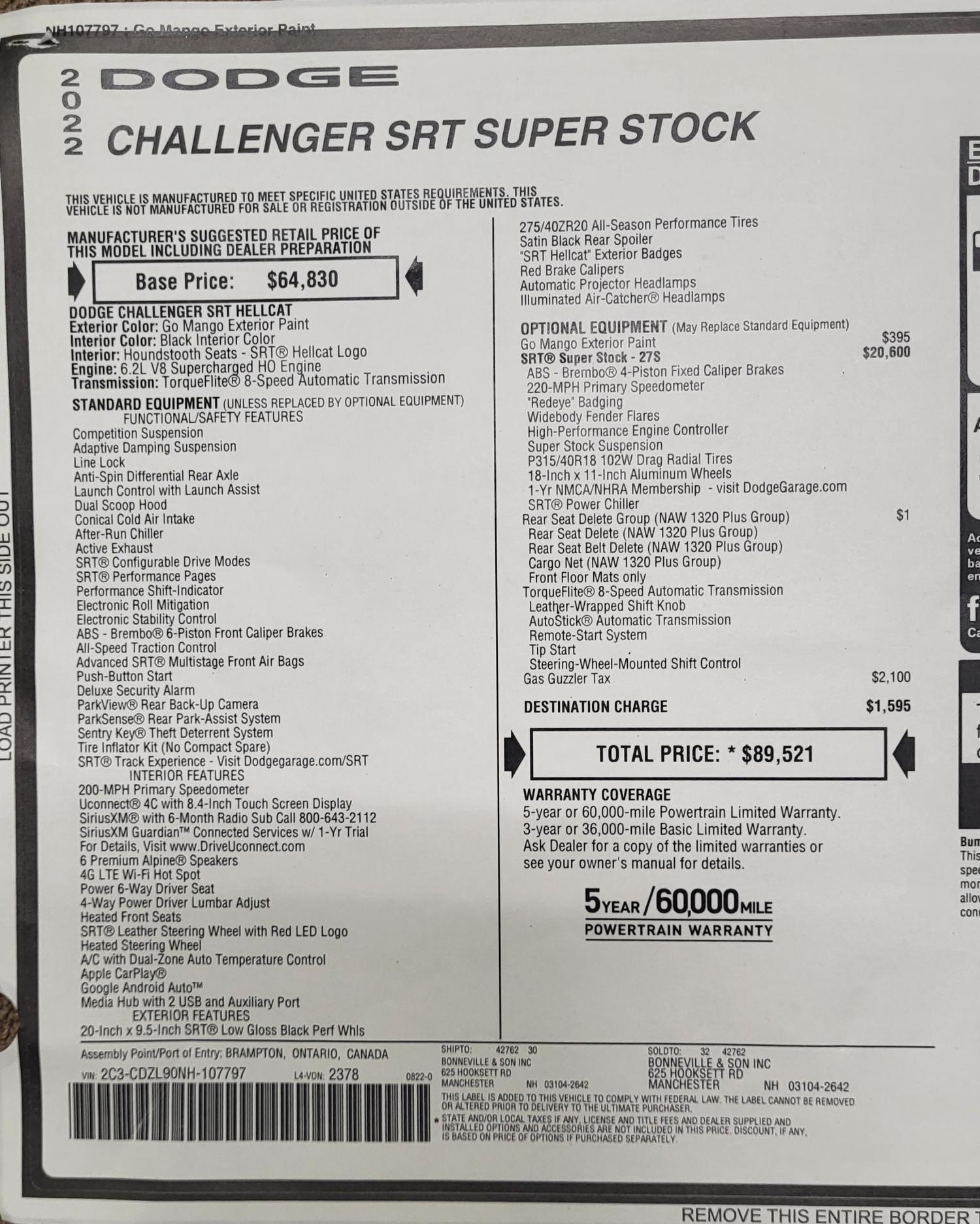 6.2 807 HP Supercharged V8. 1,100 miles. Always been in heated garage, never ever been wet. Car is absolutely flawless and still smells brand new inside. Basically a Demon without the transbrake. 100% original, never modified in any way. I ordered the car brand new, 1 owner. 1500 total production over 4 year run. Dodge Maxcare 8 year 60,000 miles warranty. Go Mango with rear seat delete. $84,500. 603 493-3884