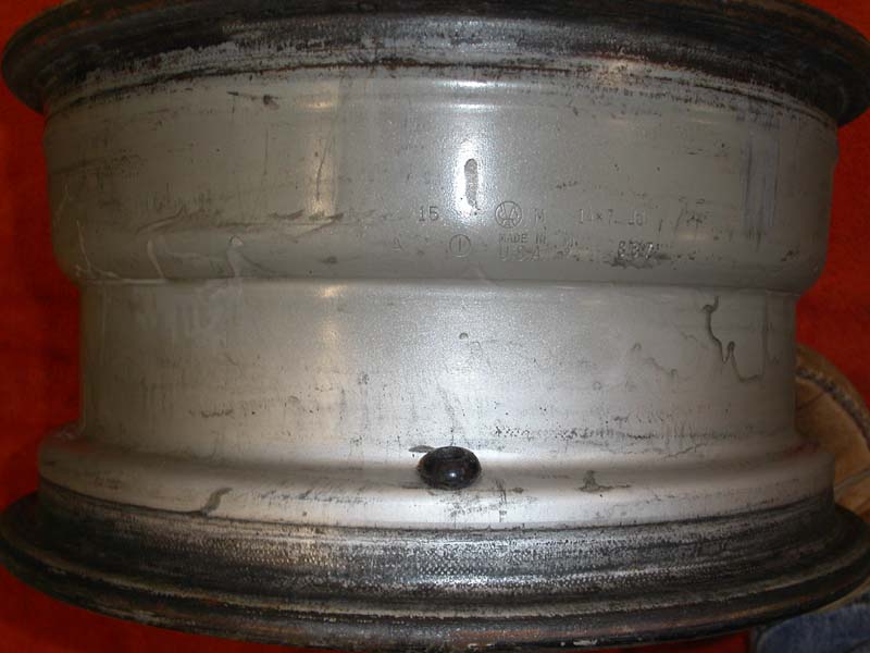 Here are a series of 4 pictures taken from my original unrestored AO 12 15 wheels (1970 application). I'll let Rick inform us of the actual colors, order of painting and if this is identical to 1969 as well. This picture is of the front of the wheel which is Argent Silver. The color is faded after 35 years but appears to be almost a satin finish for the Argent Silver. There is a somewhat fuzzy line between the Silver and the Charcoal Grey at certain points. The Charcoal Grey appears to be almost flat in sheen.