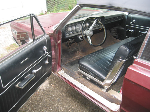 -Interior is black vinyl with a bench seat and is in surprisingly good condition, including the dash & door panels. The carpet is intact, but faded.