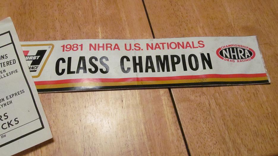 These werent purchased back in the day,they were earned.recentoy acquired loads of time slips,decals and other stuff from a former world champions collection. 1981 US nationals class winner bumper sticker. Never used, as shown 120.00 OBO Much more available incvluding 1968 1969 summer nationals laRGE posters ,originals AND WORLD RECORD TIME SLIPS, dover posters and flyers,etc.