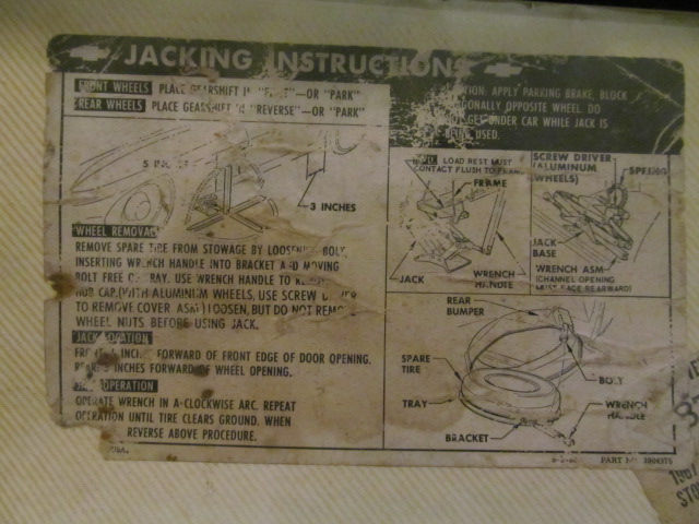 For sale is a set of 2 trunk board decals. They are originals and were from a very early production red interior 427 car that had a vin that was around 200 . The jacking instructions are dated 5/66 and the interior carpet tag 7/66 And states RED interior on it. It also designates that it could either be convertible or coupe,although it was from a convertible. These are must have items for an ncrs car, they are not perfect as shown, but obviously hard to find as they are normally very difficult to remove from the cardboard jack storage tray. 150.00 for the pair of decals until listed on ebay