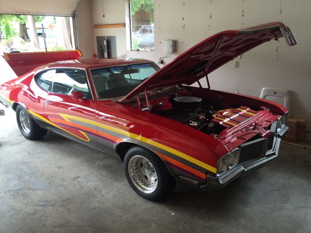 Met a new car today, a Porsche Guards Red '70 442 with 25+ year old Graphics, Center Lines, and a thumpin' Mondello-style 455 backed by a Tremec 5 speed and Ford 9" rear. Painted red with graphics under the hood, too. Well, except the inner fenders, they're not painted. They were already red, (how convenient).