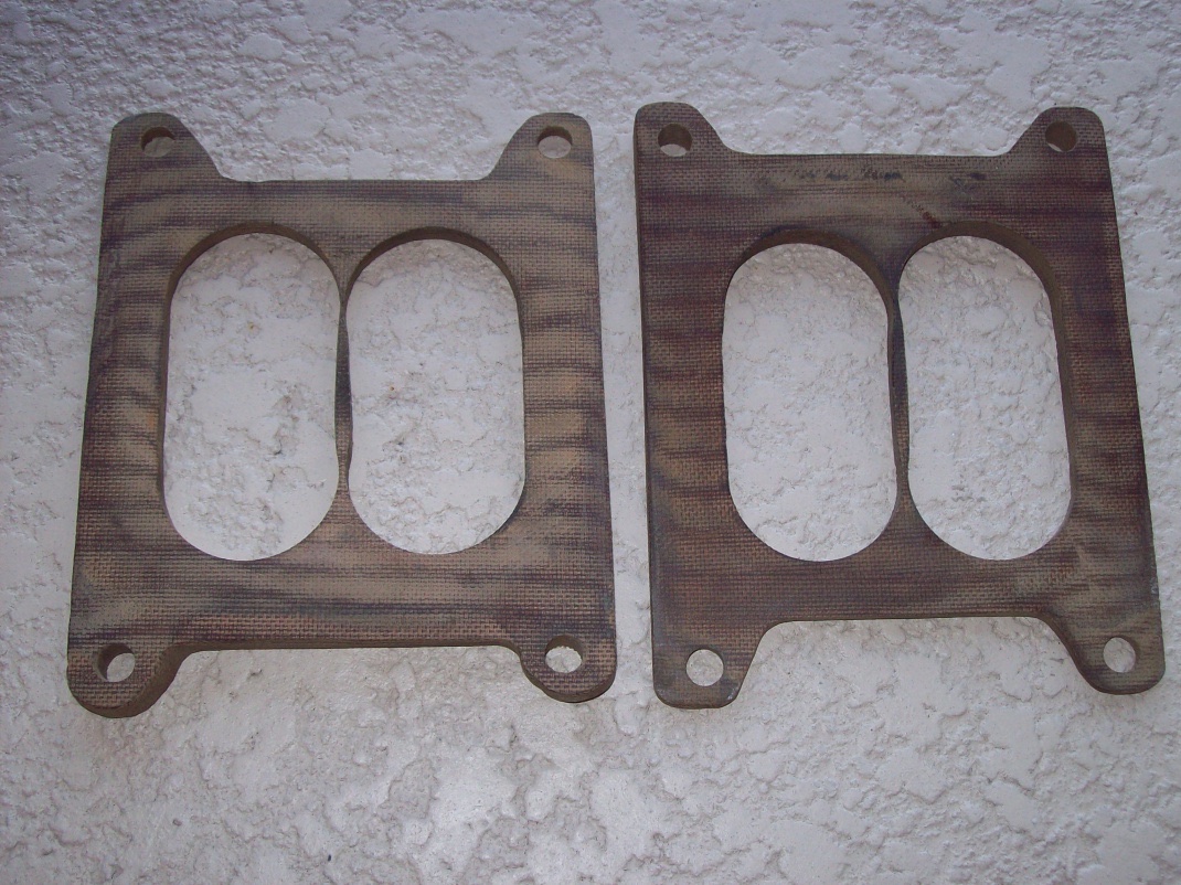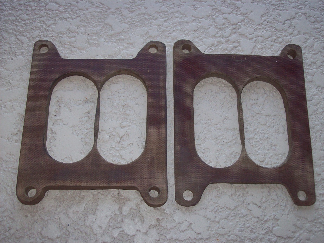 I have never seen these before. Chime in if you know exactly what application or usage these are for. Each gasket has an angled base made out of a wooden fiber and are in Excellent condition. IMO looks like it fits Holley carbs. *UPDATE* >> PHENOLIC RESIN is the gasket material which has a thermal conductivity rating of 2.01. While not as good an insulator as wood, it is far more resistant to fuel and chemicals, making a resin spacer more durable.