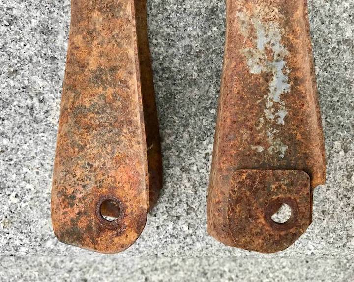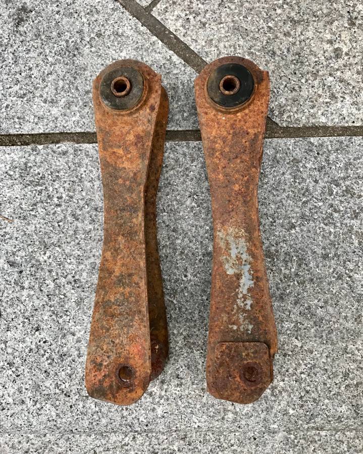 This is an original pair of GM upper control arms for 1968-72 Chevelles & El Caminos that were equipped with a 12-bolt rear axle. The left arm is notched and is reinforced around the bolt hole from the factory to clear the size of the differential housing. They are in good restorable condition with the original bushings intact. (SOLD)