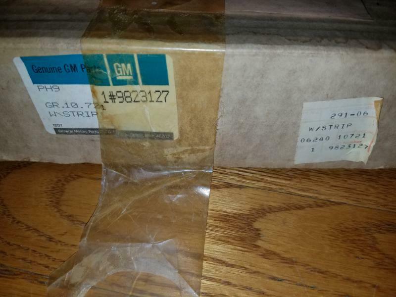 A pair (LH / RH) NOS Roof Rail Weather Stripping #9823126 RH / 9823127 LH in there original GM Boxes, which appear to have been purchased in 1980, according to a receipt that is taped onto the box. They are in excellent condition still soft / pliable and un-damaged. The weatherstripping also have 5586 and 5587 molded into the rubber.
