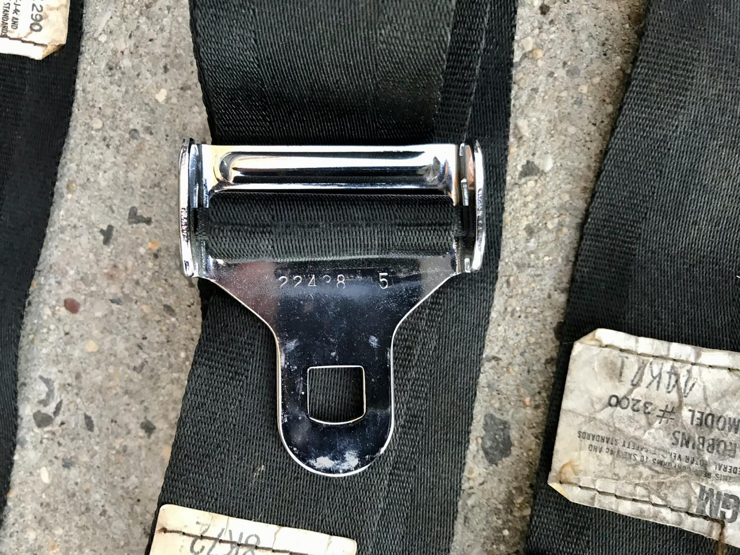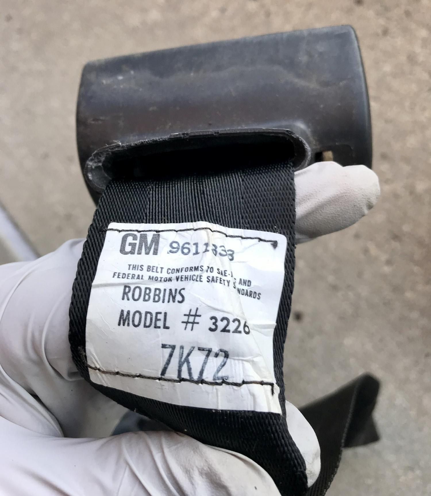 These are black seat belts out of a 1972 Chevelle, RPO AV3 (3 point). They are the small buckle design that was introduced in 1972. They will fit most GM A-body cars of the same year. This is an incomplete set with missing belts so what you see is what you get. These 1972 belts are hard to find due to them being a one year only item. The belts and stitching are in very good condition with all tags present. The chrome on the latches are in great shape. The retractors work as they should. Keep in mind that these came out of a 49 year old car and they do show signs of wear & tear. The plastic button retaining rings need replacing on all the buckles as they are cracked or missing. This is a common issue on this style buckle, especially considering their age. There is a repair kit available (search “the parts place seat belt repair kit”) which replaces the spring, tongue, button, emblem, and plastic ring. (SOLD)