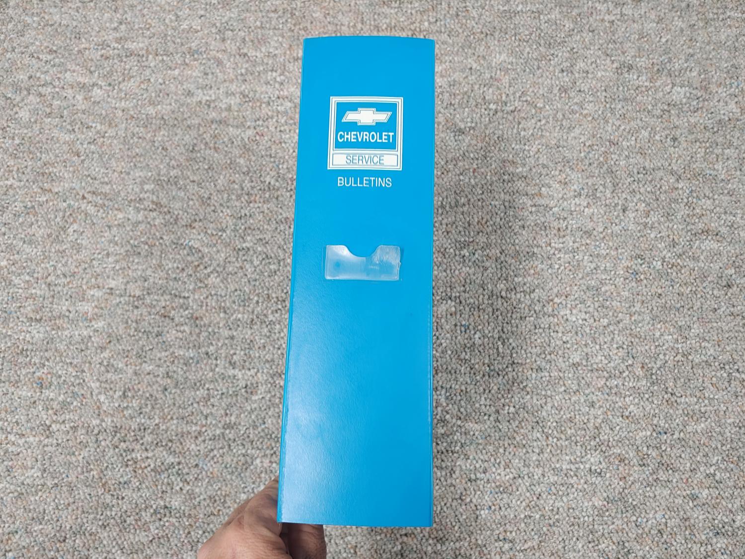 Chevrolet Dealership Service Department bulletin binder. In very good shape. The binder is used so it is not perfect. Great to put your assembly manual in. Heavy plastic. No cracks.