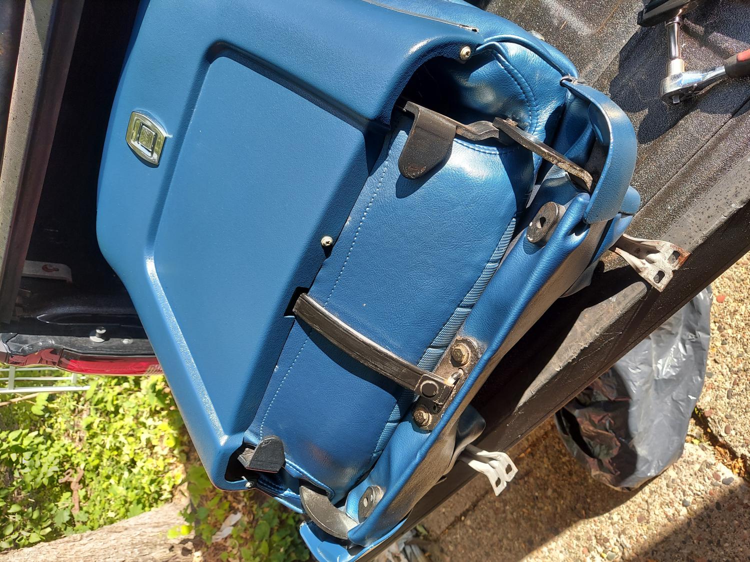Restored set of bucket seats with all new foam medium blue covers headrest and back releases buttons. Plastic covers repainted with new chrome trim. Frames and springs are perfect. The driver side lower plastic cover does have wear marks painted over. Original headrest are very nice no cracks. Power track also restored blasted cleaned then clear coated and lubed. Cables and transmission also cleaned and re-lubed. New headrest release buttons and back releases. Missing only the belt cover. $2000.00 for the buckets $1,200.00 for the power track. Never installed since restored, Bolt in and done.