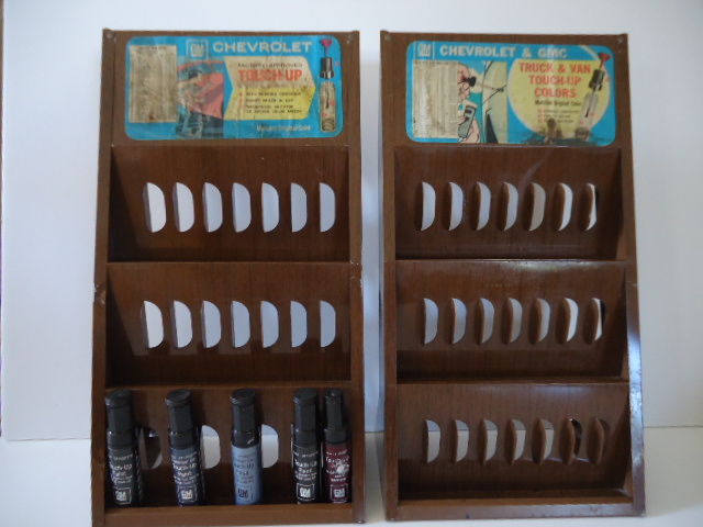 Two 1980 GM Metal Factory Approved Touch-Up Paint Display counter racks.One is CHEVROLET CARS,the other CHEVROLET & GMC TRUCK & VAN.One is holding 5 paint sticks.Both show their respective paint code charts.Can be hung on a wall too.