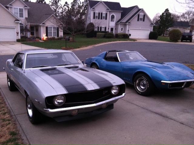 Don't see this too often. Original paint 69 Z28 parked beside a 69 Big Block Vette original paint. My buddy recently picked up the Vette and it is really a nice original car. It has a few missing pieces in the interior that need to be corrected but under the hood is really unmolested. Original hose clamps fasteners, "tape" major components etc. still in place. The wiring harness has been tampered with at the temp sending unit, but other than that all in place. Fiber optics all work, headlights wiper door etc. 89K original miles. The Z is the one I own and have already mentioned it on the site so wont go back into detail here.