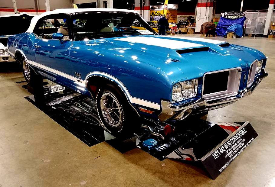 The 1971 Olds 442 W-30 convertible was sporting the beautiful Viking Blue paint with white stripes. It featured the very limited Muncie M-22 4spd option. It is one of the 32 four-speed W-30 convertibles produced in 1971 by Oldsmobile.