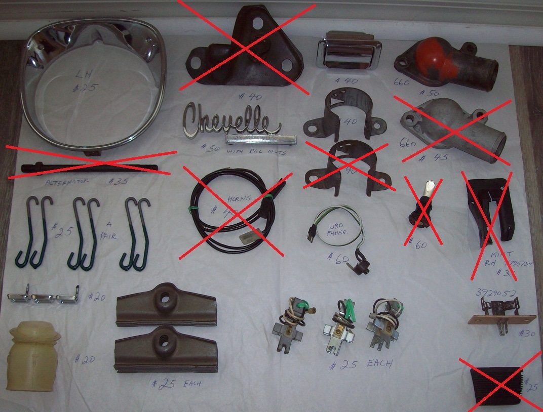 Any questions do not hesitate to ask. Lots of Excellent Used GM "Born With" Parts and some NOS parts too in this bunch. Lots of tough to find hardware in here too that I am sure someone will need or is missing on there car. Those E Brake Cable hooks are my personal batch that I dipped in the correct Green Rubber dip just like the assembly line did them. All payments with PayPal "Friends or Gift" only in USD Funds within 24 hours after "I'll Take It" is mentioned. Shipping will be exact shipping depending on order.