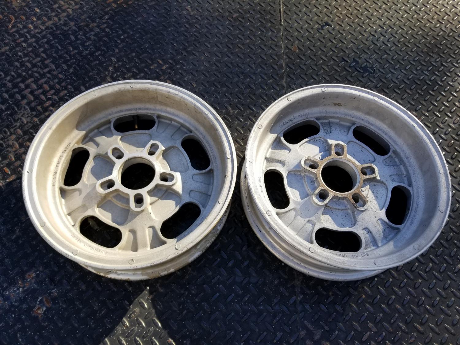 Pair of ORIGINAL 15X4 ANSEN SPRINT aluminum front wheels. They have a 4 1/2 inch bolt circle for Ford and Mopar. Not perfect, but can be used as is or easily touched up. Look at the photos, as they are an important part of the description. What you see is what you will get. Will ship anywhere at the buyer's expense. Thanks. $795.00 plus shipping