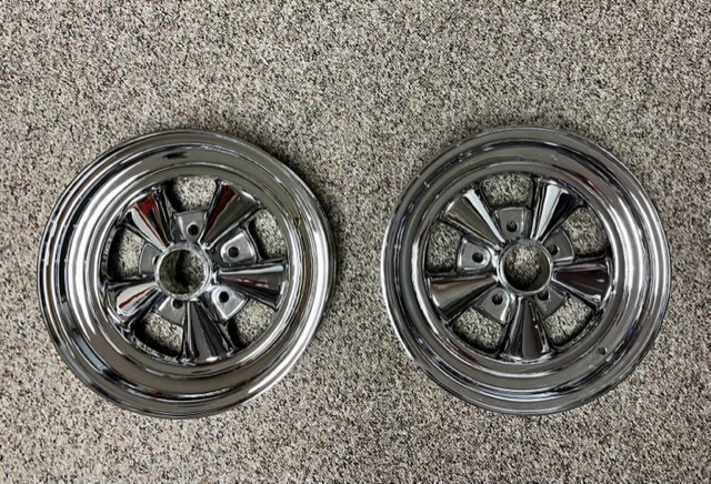 I have a direct bolt pair of 15x4 Cragars (Chevy) that were rechromed by Atlas in Texas and never mounted. They come with the non R caps that were also rechromed and a new set of lug nuts and valve stems. I can send pictures if need be to your phone or get NovaBoy Dave to put them on the Site for me.