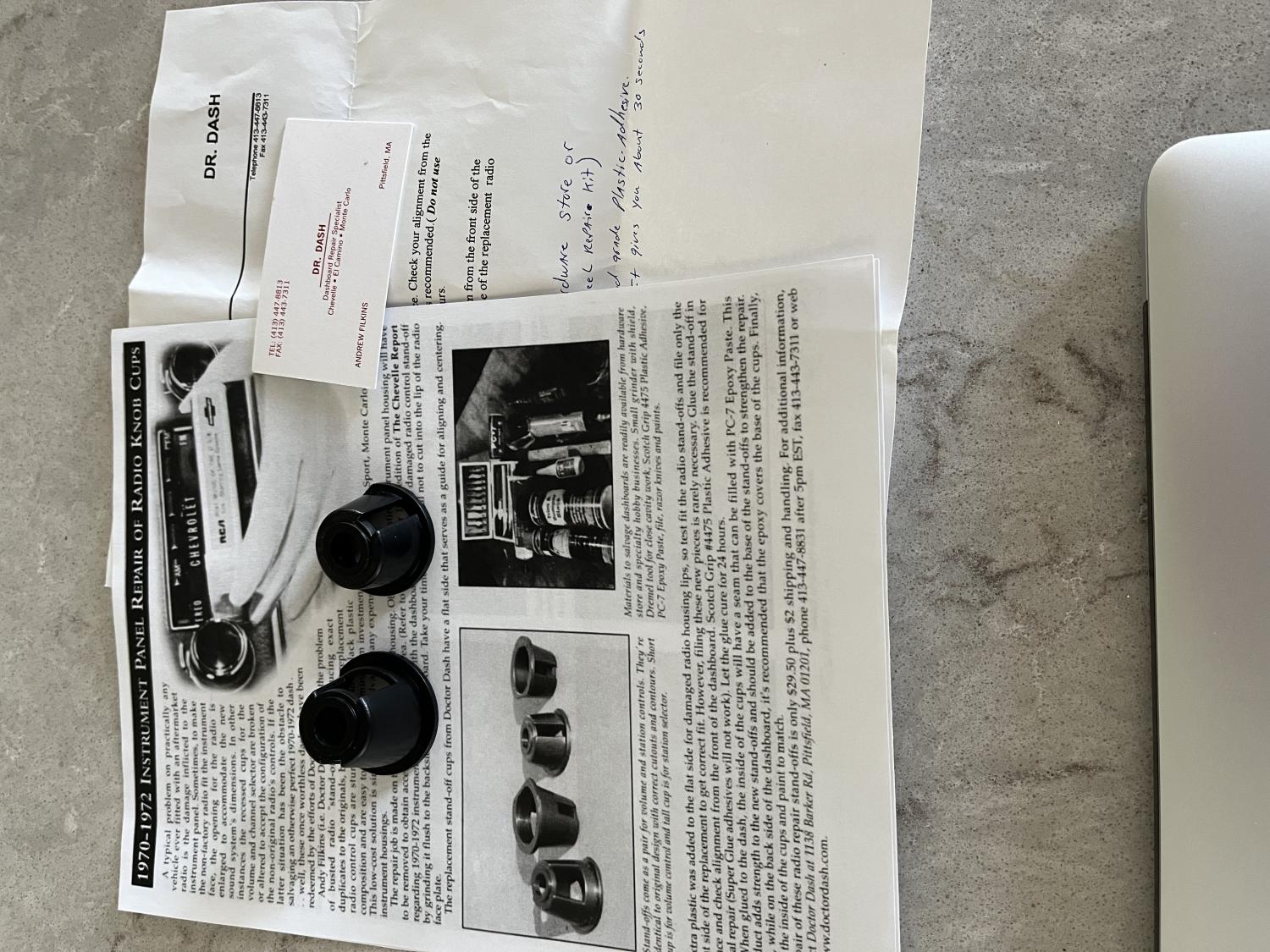 I have a pair of the radio stand off's used to repair the dash where guys cut out or to replace broken knob openings for the dash radio. These were the sets made by Andy Filkins commonly know as Dr Dash years ago complete with instructions to install the cups.