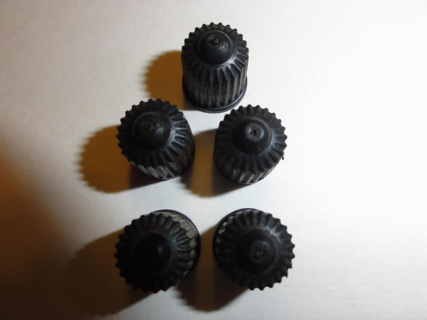5 Schrader assembly line valve stem caps, ribbed knub top style . Found in an old closed down wheel alignment shop. Excellent condition .Multiple sets available ( 360.00 Free shipping lower 48 states).