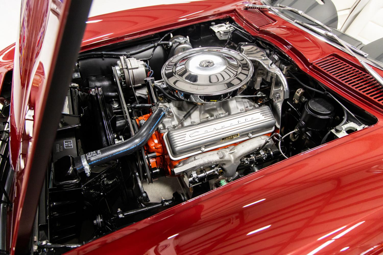 The exterior of this Corvette is absolutely stunning in every sense of the word. This was a “No-Hit” body and retains all of its original fiberglass body. Prior to the restoration it still retained its original worn paint which was stripped to bare fiberglass. The body is extremely straight with excellent gap lines throughout. It was refinished in its original color of Milano Maroon which is beautiful. The paint is high show quality and was recently detailed to a brilliant shine by the team at MS CLASSIC CARS. The door jams were refinished in the correct shade of color. It was outfitted with a new black convertible soft top which fits very nicely. Everything on the exterior was restored or replaced such as all the Soft-Ray stamped tinted glass, glass stainless trim, wiper arms, driver's side mirror, front bumpers, parking light bezels, headlights, door handles, antenna, tail light bezels, rear bumpers and emblems. The cars rolls on new 15” aluminum knock-off wheels and are mounted with 7.75-15 Goodyear goldline tires. It's equipped with new side exhaust pipes and from the information gathered this car was originally built with side exhaust. Everything on the exterior is in working order such as the flip-up headlights, parking lights, turn signals, brake lights, reverse lights and wipers.