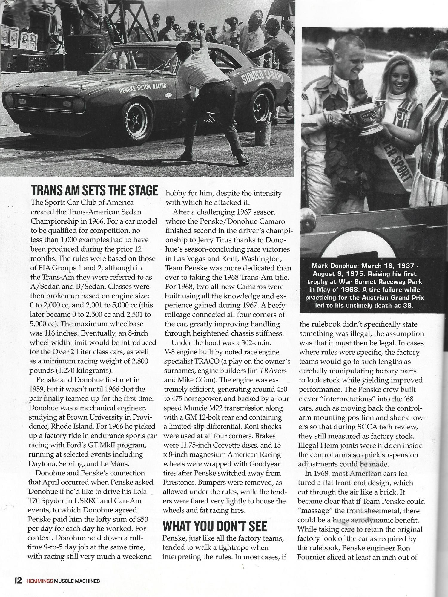 How fitting that it's in the last issue of Muscle Machine and the cover says it all- Trans-Am Domination. Yes winning 9 of 11 races is domination but a complete team effort made it possible from team owner Roger Penske, Mark Donohue, Sun Oil, GM engineering and the ability come up with the many Unfair Advantages by interpreting/bending the rule, just better than their rivals.