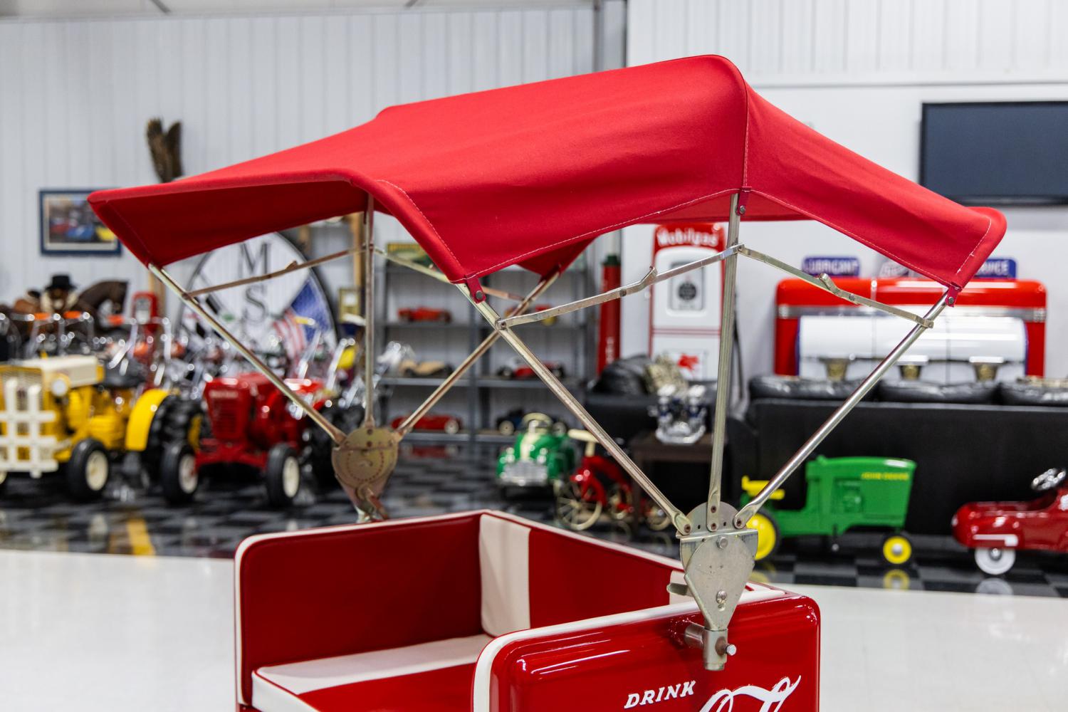 This eye-catching vintage Coca-Cola Cooler Custom trailer is a one-of-kind piece that was built to show quality standards. From the information gathered this authentic Coca-Cola ice chest cooler was originally produced in the 1950's. During the restoration process which started in 2014, the back and center of the cooler was fabricated to accommodate a functioning seat platform. The cooler was mated to a custom made steel framed trailer with a 1 7/8” hitch. The trailer was painted black and outfitted with 12” polished deep dish wheels. The wheels are decorated with spinners and International Harvester center caps. The wheels are wrapped with Carlisle Turf Saver 23x10.5 - 12 tires with 2014 date codes. The restoration was put on hold and eventually sold in 2019 to a gentleman who lives in Connecticut. This gentleman completed the restoration in 2020. The cooler was prepped and painted in the correct shade of red with white lettering on all four sides. The lettering reads “Drink Coca-Cola” and “Ice Cold”. The beautiful paint was recently detailed to a brilliant shine by the team at MS CLASSIC CARS. The backside of the cooler has the original bottle opener still intact. The interior space was upholstered with matching red and white vinyl. The seat sits on a wood platform and is removable. A folding frame with red canvas top was attached to the sides of the cooler. This convertible top provides shelter from the weather and shade from the sun. The frame was outfitted with platform that was finished in textured black paint. This allows easy access to the seating surfaces in the cooler. Multiple dimensions are listed below.