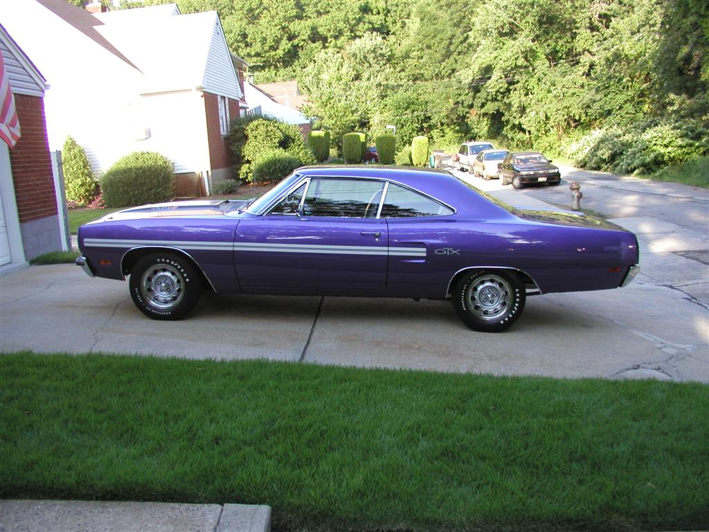 Here's my 69 GTX. Nothing crazy, 440 Super Commando, Hemi 4 speed, 3.54 Dana rear. F5 green, green interior, green vinyl top. Ordered without PS or PB, no A/C. It had the Magnum 500s on it when I bought it in 2007 but I also liked the steel wheel look so I switched a little while after buying it.